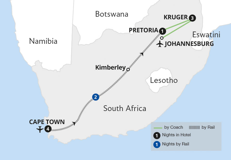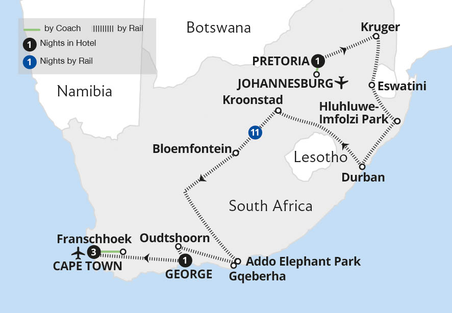 Join us on this sensational tour of Southern Africa, from the glorious Victoria Falls to the multicultural city of Cape Town, with fantastic wildlife viewing in Botswana's Chobe National Park and Nambiti Reserve in Kwa-Zulu Natal. Added to these superb experiences, a rail journey from the city of Pretoria to the coastal metropolis of Durban...