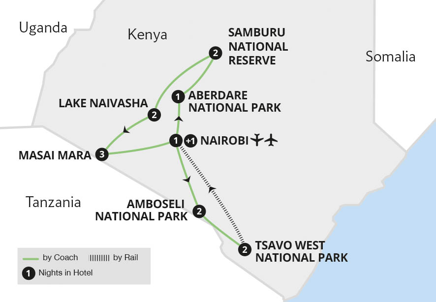 Experience magnificent Kenya, the world's first safari destination, on a grand tour of seven top reserves. See amazing wildlife in the acclaimed Maasai Mara, Amboseli in view of Mount Kilimanjaro, Taita Hills Wildlife Sanctuary, Lake Nakuru in the ancient Rift Valley, Samburu, Aberdare and Tsavo West national parks. Meet the Maasai people,...