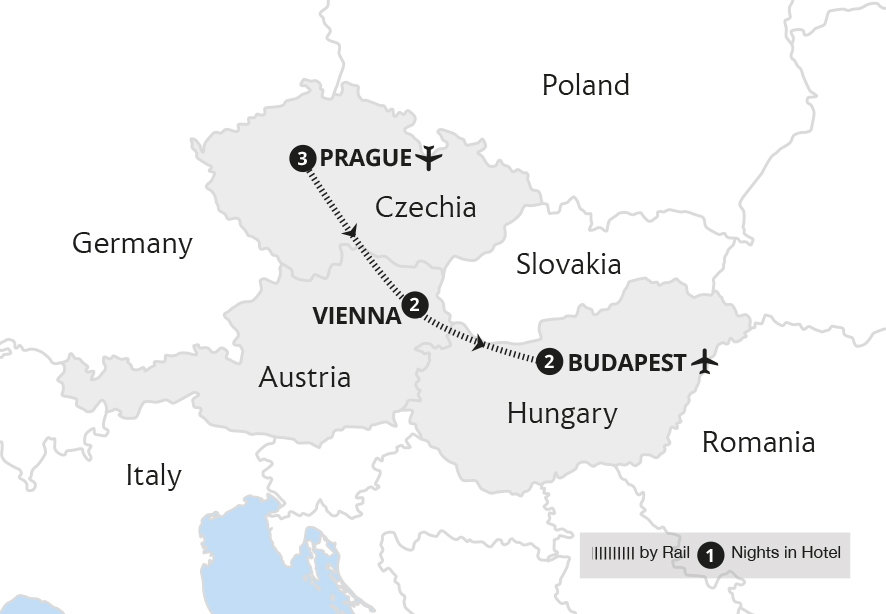 Discover the fascinating cities of Prague, Vienna and Budapest, encountering their rich heritage of art, history and culture while visiting world-class castles, palaces and museums. Fly into Prague to experience the medieval charm of the Czech capital, a magical city of exquisite architecture. Continue by train to Vienna and uncover the timeless...