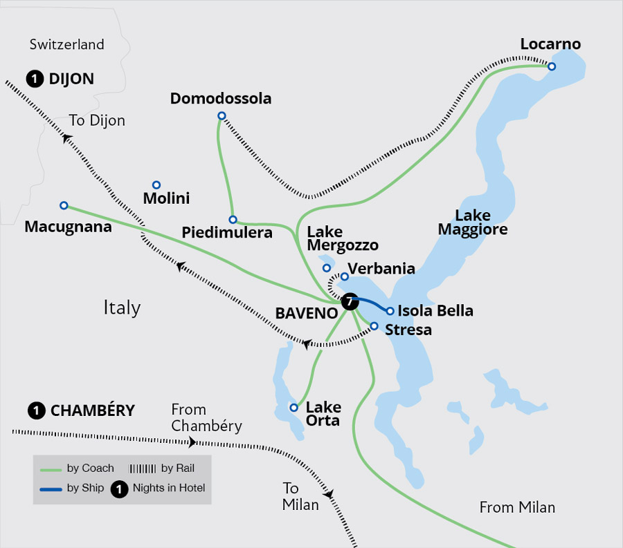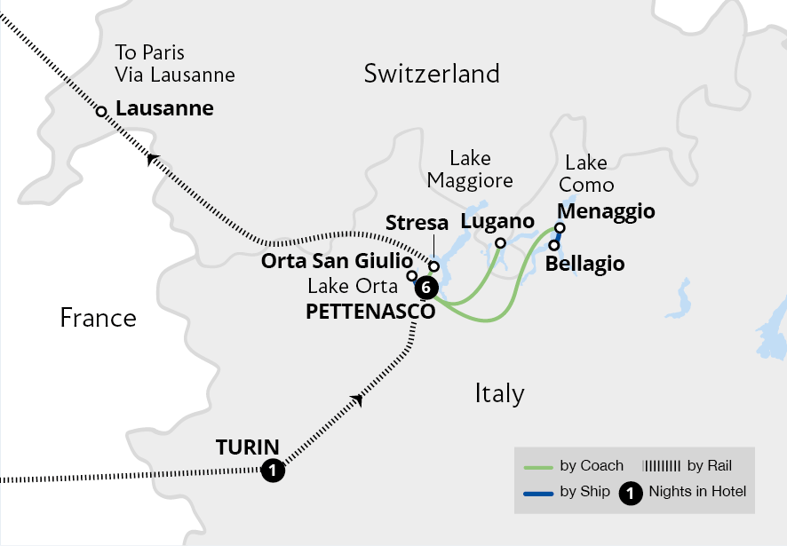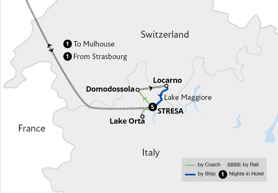 Explore the serene beauty of Italy's lakes from a base in the attractive town of Stresa, a haven for artists and writers over the centuries nestled on the shore of Lake Maggiore. Enjoy a cruise to an island monastery on Lake Orta and explore the lakeside village of Orta San Giulio. Journey through the Alps to Switzerland on the Centovalli Railway...