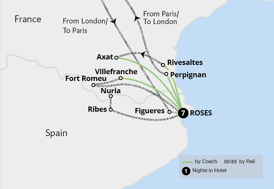 Our tours based in the charming seaside town of Roses are all about relaxation. Bask on the glistening Catalan coast, ride into the foothills of the Pyrenees on the famous Little Red Train and take a trip on the Núria Valley Rack Railway through a peaceful valley. Besides scenic trains, uncover the world of surrealist artist Salvador Dalí on a visit to his exuberant museum in Figueres, and explore the picture-perfect town of Besalú.