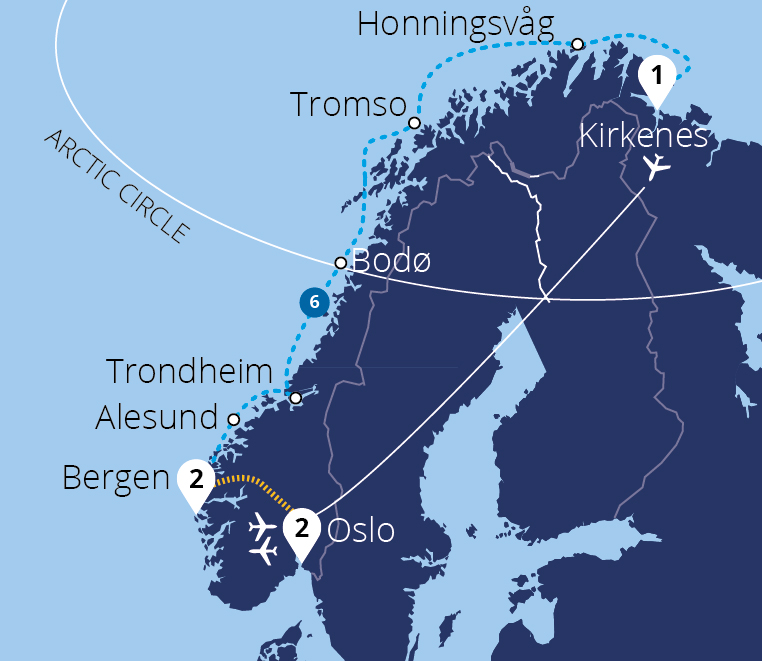 Experience Norway in magical winter, exploring Oslo and Bergen with an epic journey on the stunningly scenic Bergen Railway, before embarking on a six-night cruise into the Arctic wilderness. Our northbound sea voyage from Bergen to Kirkenes passes beautiful fjords, and crosses the Arctic Circle, before a husky sled ride into winter wonderland...