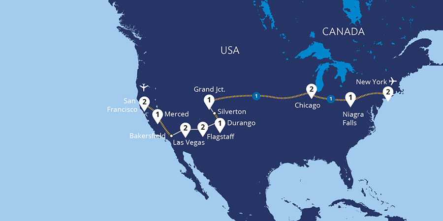 Join us on an epic tour across the monumental United States, a once-in-a-lifetime journey to some of America's most celebrated cities - San Francisco, Las Vegas, Chicago and New York - visiting iconic landmarks including Monument Valley, Yosemite, the Grand Canyon and Niagara Falls. This incredible journey also features legendary trains - ...
