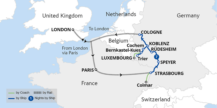 Continuing our journey, we discover Cochem's medieval charm, Bernkastel-Kues' vineyard-draped hillsides, and Trier's historic architecture. This holiday ends with panoramic vistas aboard the Drachenfels railway as we enjoy unforgettable views of the Rhine Valley. Join us and let the Rhine and Moselle be your guide to a spectacular cruise.