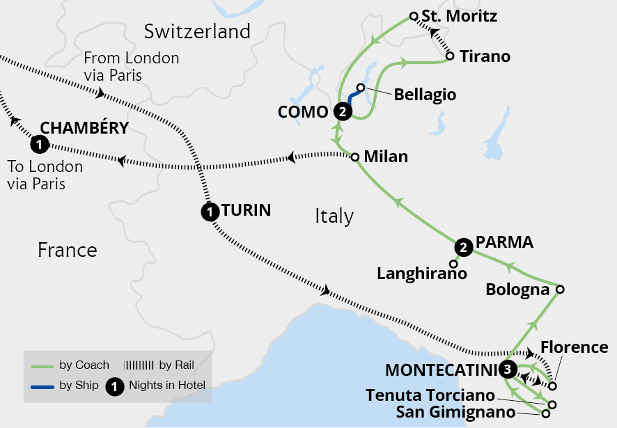 Travel through Tuscany to Florence and San Gimignano, where we witness centuries of art and architecture and learn about pizza and wine at a 300-year-old estate. Continuing to Emilia-Romagna, experience the culinary traditions of Bologna and taste Parma ham. Rounding off this journey, a relaxing stay at Lake Como and a sensational First Class rail journey to St Moritz on the Bernina Express leave you captivated by Italy.