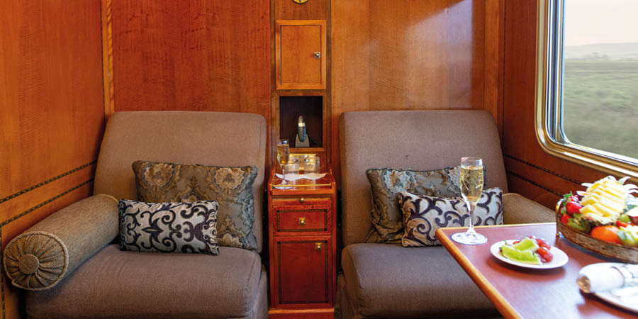 Filled with light and decorated with polished wood paneling and lush fabrics, De Luxe Suites are as cosy as they are luxurious. There are four of these suites in each sleeper carriage, with three featuring two twin-size beds and the fourth with a double bed. Watch South Africa's ebbs and flows unfold while sitting in plush armchairs or on a lounge, and enjoy the convenience of an ensuite bathroom with either a shower or a three-quarter size bathtub. Upscale toiletries, complimentary Wi-Fi, personalised butler service and endless comfort come as standard.